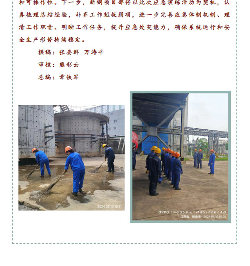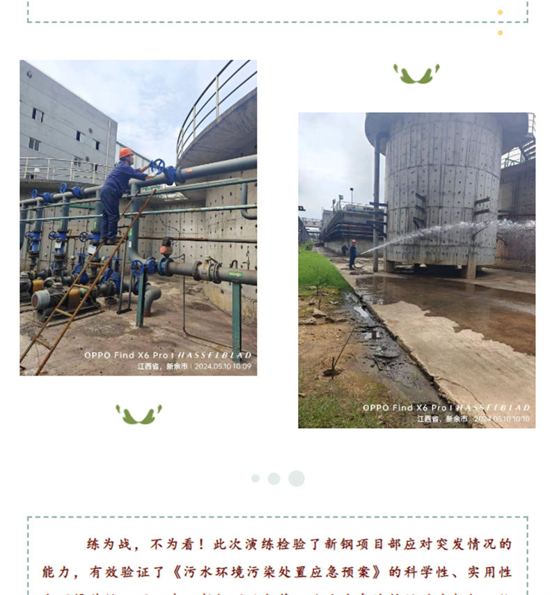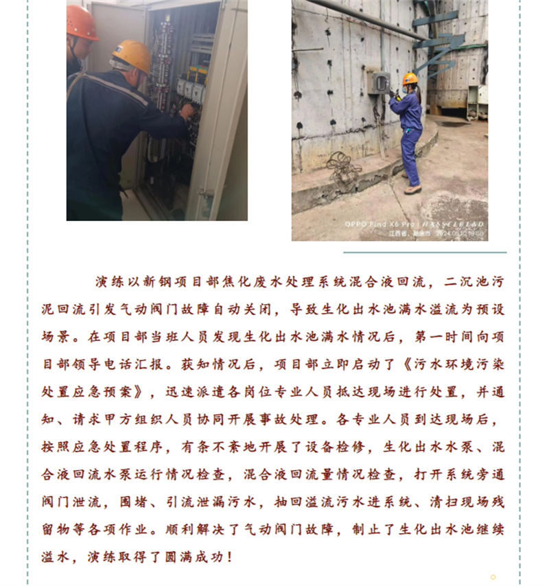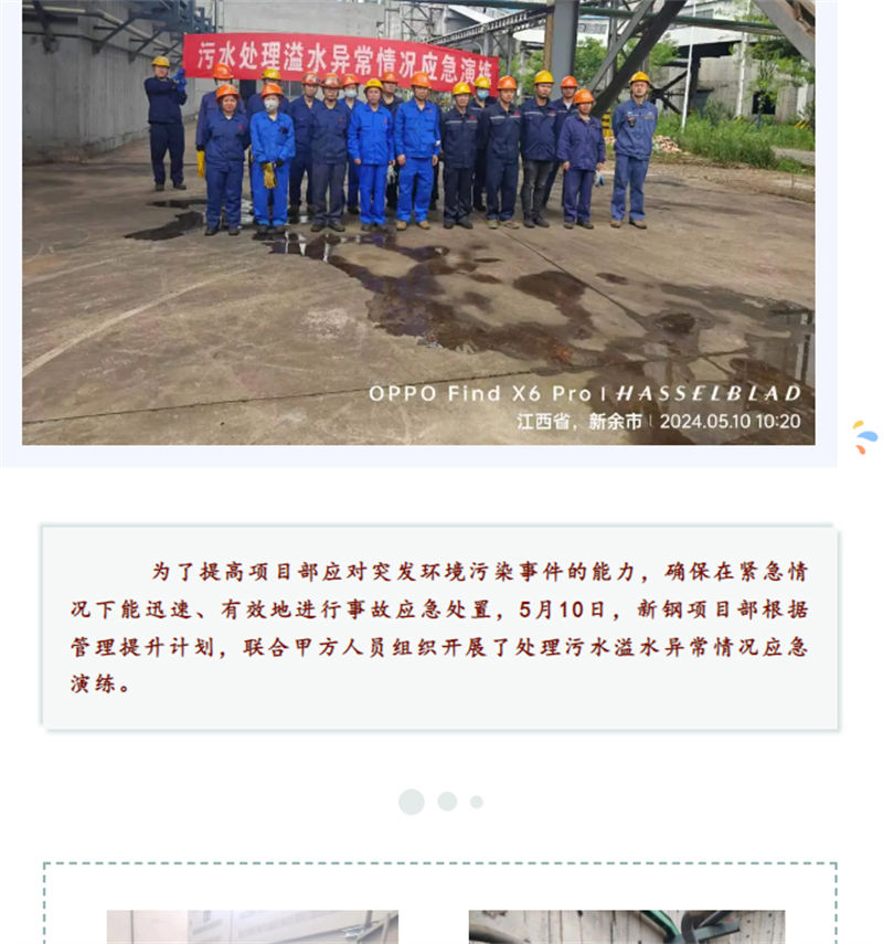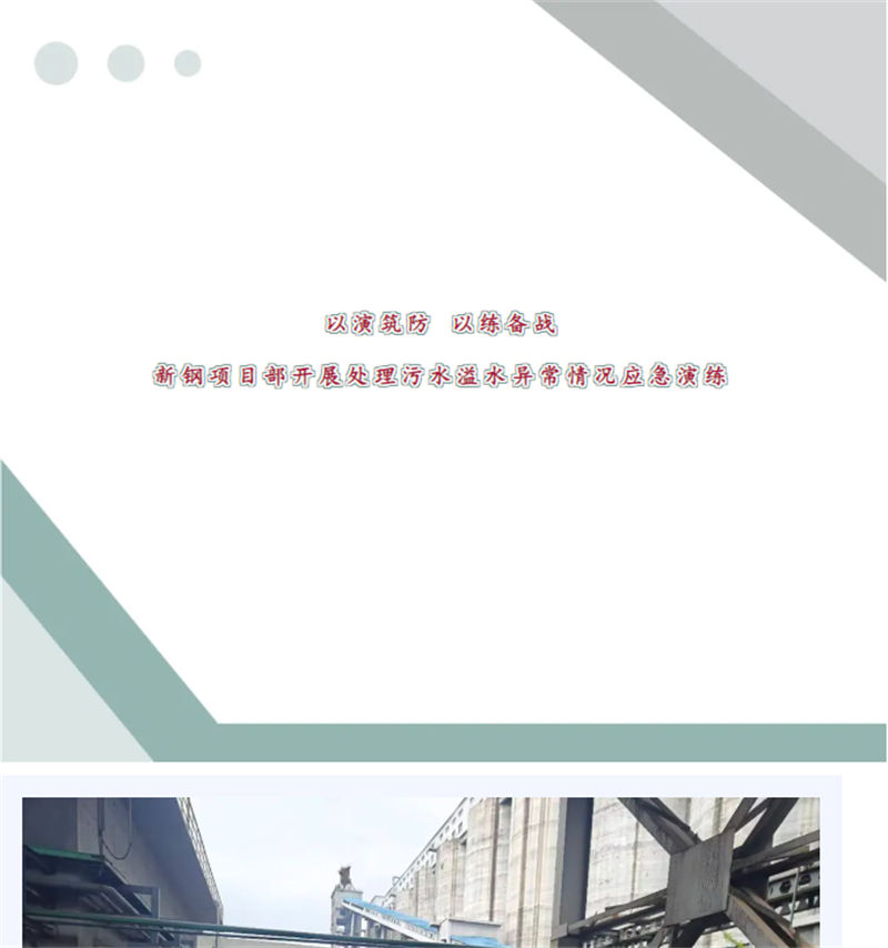 為了提高項(xiàng)目部應(yīng)對(duì)突發(fā)環(huán)境污染事件的能力,確保在緊急情況下能迅速、有效地進(jìn)行事故應(yīng)急處置,5月10日,新鋼項(xiàng)目部根據(jù)管理提升計(jì)劃,聯(lián)合甲方人員組織開展了處理污水溢水異常情況應(yīng)急演 練。